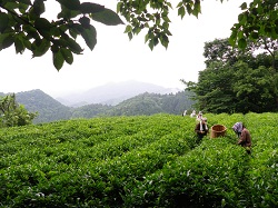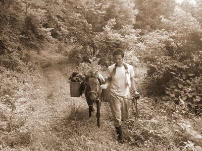 完全無農薬の山の茶畑です。摘んだ茶葉を馬で運びます。この茶葉で「馬茶(うまちゃ)」という発酵茶を作ります。